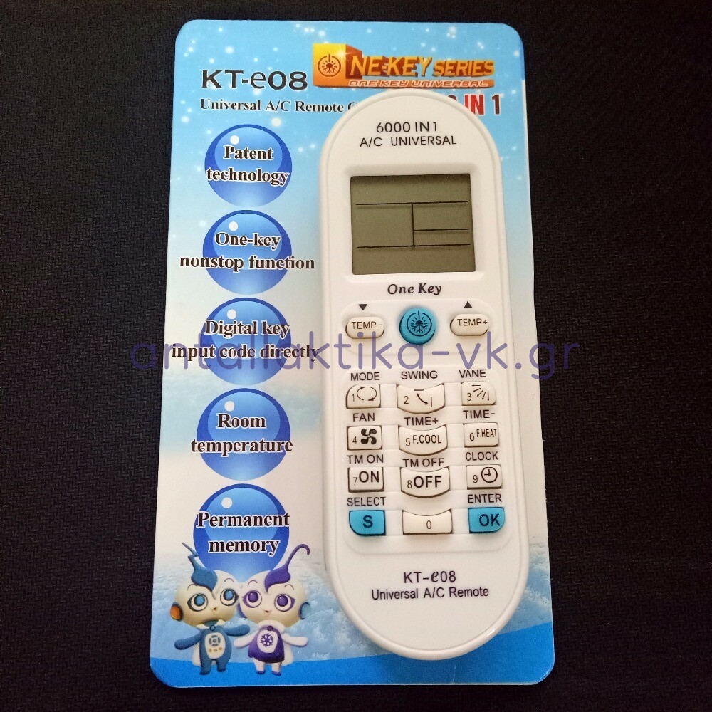 KT-e08; air conditioning remote control - universal KT-4000, controls functions of more than 6000 device models, room temperature display, permanent memory, manual code entry / auto tuning, one key function - ambient temperature control evaluates heating demand (default 26 ° C) / cooling (default 20 ° C) and automatically adjusts the flow direction and fan power ALPIN, Aucma, AUX, Banshen, BOERKA, CARRIER, CHANG HONG, chigo, Chōfu, Chunlan, CORONA, CONROWA, CONSUL, DAEWOO, DAIKIN, DOCTOR, Dongbao, DONGXINBAO, ELECTROLUX, FEDDERS, FRESTECH, Fujitsu, Funai, Galanz, GENERAL, GUOQIAO, GLEE, GOLDSTAR, GREE, HAIER, Hisense, HITACHI, Huabao, Huake, Huamei, HUALING, HUIFENG,, HUIKANG, HYUNDAI, JDC, JIANGNAN, JINTAR, Jinsong, Johson, Kangli, Kelon, KLIMATAIR, KOLIN, Konka, LG, Liang-jü, LITTLE DUCK, LOREN-SEBO, MACQUAY, MICOM, MIDEA, MITSUBISHI, Noritz, OMEGA, National Panasonic, Panda, Philco, PROTON, Raybo, ROWA, SABRO, Saijo Denki , SAMPO, SAMSUNG, SANYO, Sasuki, SHANG Ling, Shanxing, SHARP, Shengfeng, Shuanglu, SHUAIKANG, Songge, SOVA, SUMMER, SUNDRUNG, SWAN, TADIRAN, TATUNG, TCL, TECO, TIANDI, TOSHIBA, TRANE, UNI-AIR, WANBAO, Weili, WHIRLPOOL, XILENG, Xinle , Yangzi (Yair), YINYAN, YORK, Zhen BAO