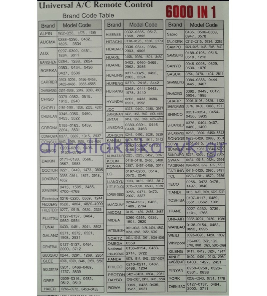 Μάρκες Μοντέλα : CHUNLAN DAEWOO ELECTROLUX FUJITSU FUNAI GOLDSTAR HAIER HITACHI LG MIDEA MITSUBISHI NATIONAL PANASONIC PHILCO SAMSUNG SANYO SHARP TECO TOSHIBA TRANE WESTAIR WHIRLPOOL KLIMATAIR CARRIER HYUNDAI YORK CHANGHONG CHIGO DAIKIN DONGBAO GREE HUIFENG KELON MACQUAY RAYBO SHINCO SOVA WEILI HUALING HUIKANG CORONA HISENSE SAIJO DENKI JDC KONKA CHOFU TCL JOHSON GALANZ KANGLI HUABAO SHUANGLU UNI-AIR DOCTOR CONROWA SHANGLING GENERAL ALPIN AUCMA AUX BOERKA DONGXINBAO GLEE HUAKE HUAMEI JINDA JINSONG KOLIN LIANGYU LOREN-SEBO NORITZ PANDA PROTON SABRO SASUKI SONGGE SUMMER SUNDURG TADIRAN TATUNG TIANDI XINLE YINYAN BANSHEN CONSUL LITTLE DUCK MICOM ROWA SHUAI KANG SWAN WINIA FEDDERS FRESTEC XILENG YANGZI